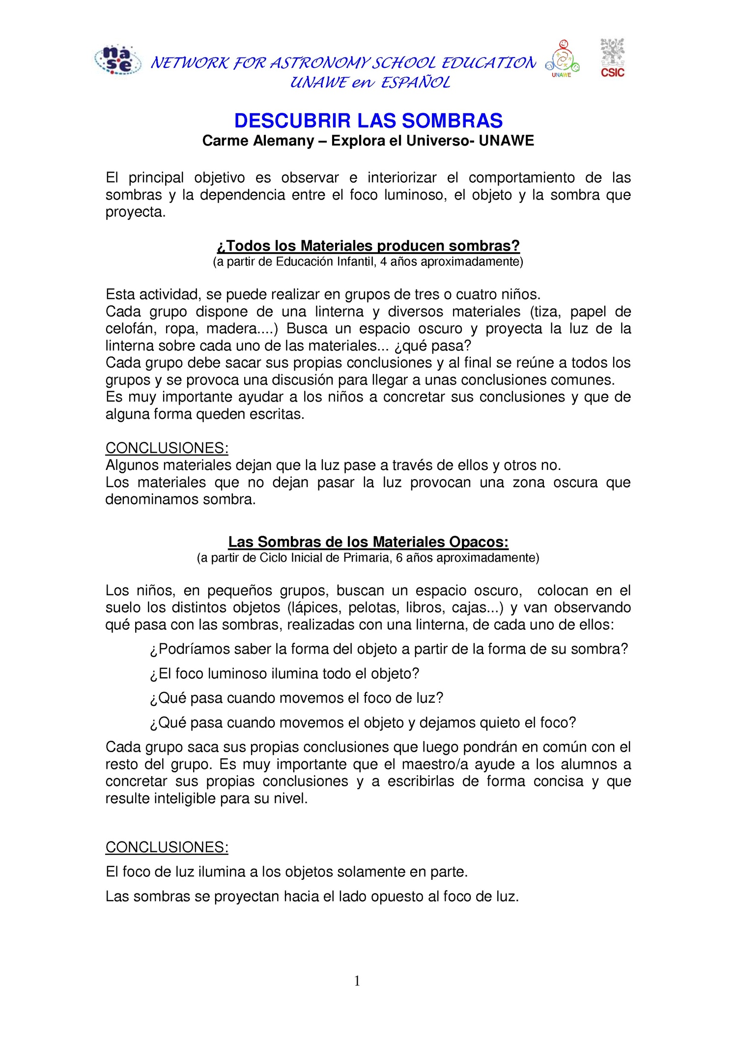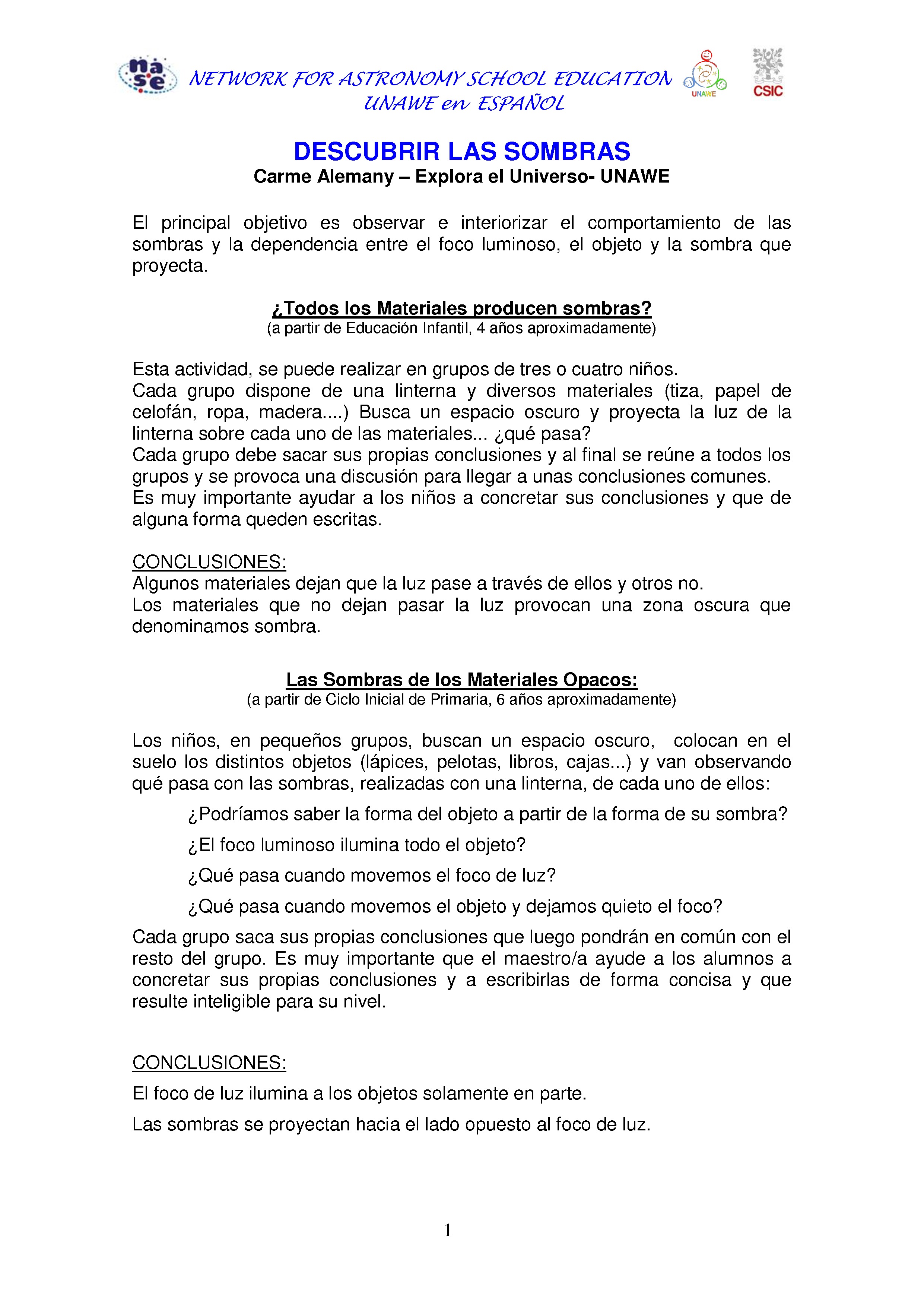 El principal objetivo es observar e interiorizar el comportamiento de las sombras y la dependencia entre el foco luminoso, el objeto y la sombra que proyecta.