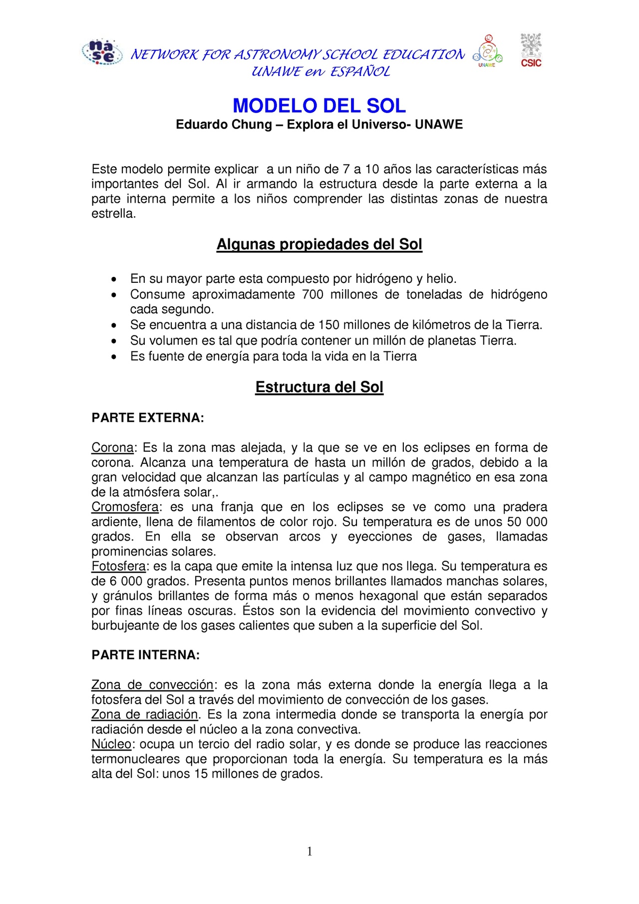 Este modelo permite explicar a un niño de 7 a 10 años las características más importantes del Sol. Al ir armando la estructura desde la parte externa a la parte interna permite a los niños comprender las distintas zonas de nuestra estrella.