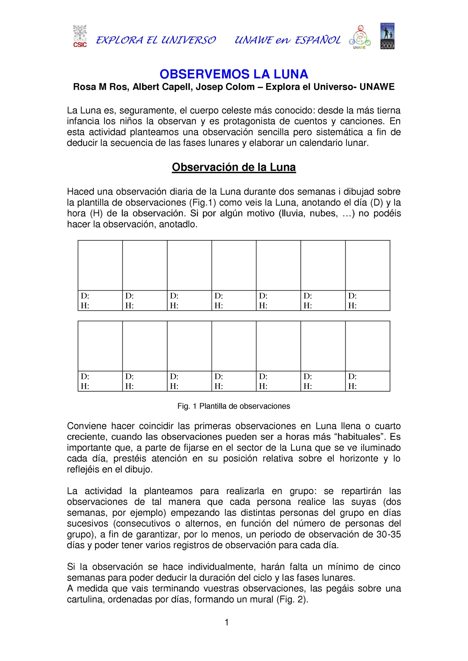 La Luna es, seguramente, el cuerpo celeste más conocido: desde la más tierna infancia los niños la observan y es protagonista de cuentos y canciones. En esta actividad planteamos una observación sencilla pero sistemática a fin de deducir la secuencia de las fases lunares y elaborar un calendario lunar.