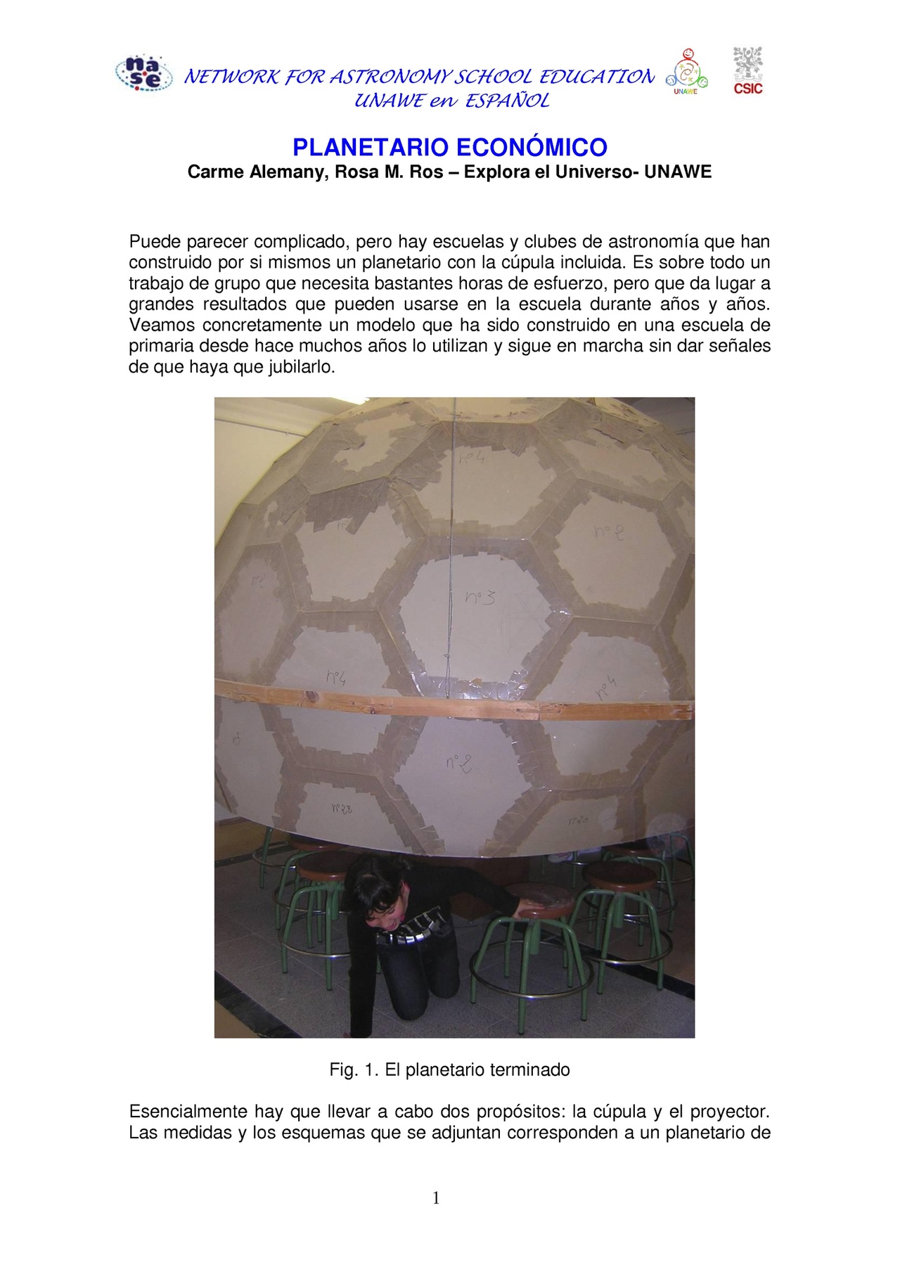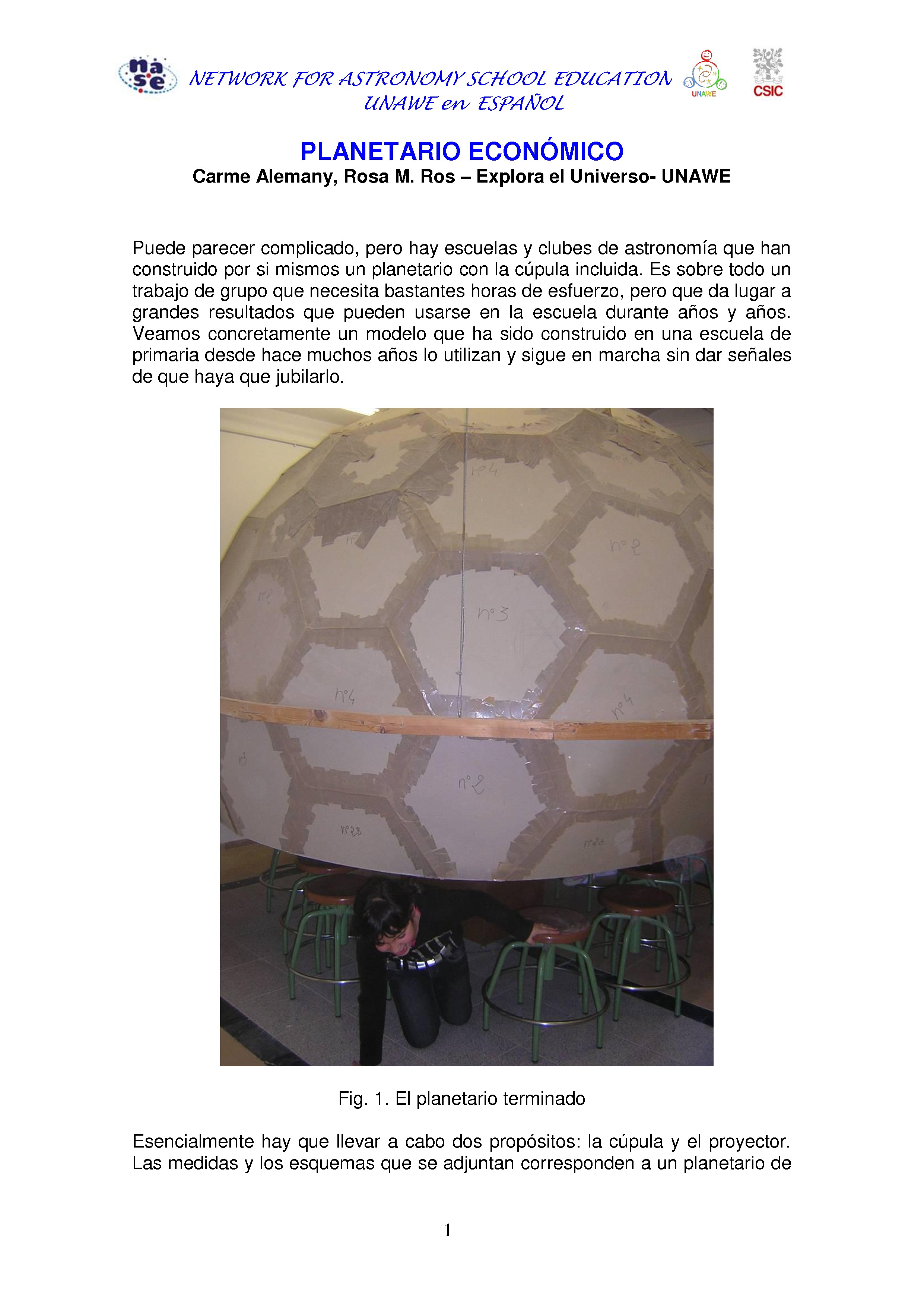 Puede parecer complicado, pero hay escuelas y clubes de astronomía que han construido por si mismos un planetario con la cúpula incluida. Es sobre todo un trabajo de grupo que necesita bastantes horas de esfuerzo, pero que da lugar a grandes resultados que pueden usarse en la escuela durante años y años. Veamos concretamente un modelo que ha sido construido en una escuela de primaria desde hace muchos años lo utilizan y sigue en marcha sin dar señales de que haya que jubilarlo.