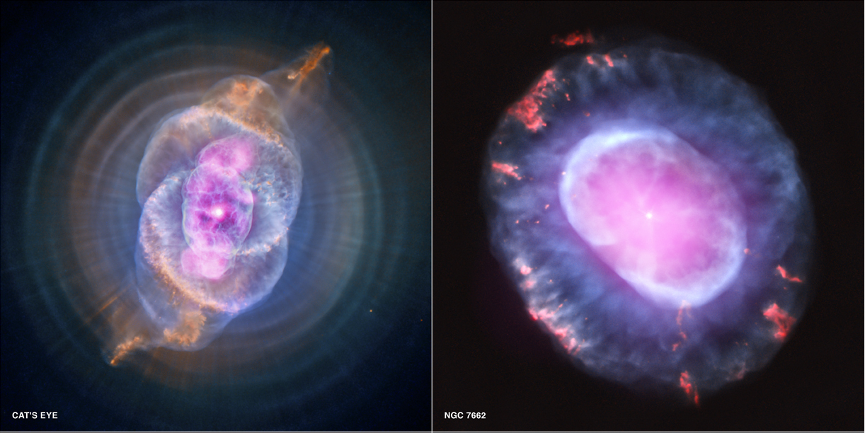 ¡Los astrónomos se han embarcado en una caza para pillar tantas nebulosas planetarias como puedan! Las nebulosas planetarias son simplemente nubes brillantes de gas y polvo, y no tienen realmente nada que ver con los planetas. Ahora los astrónomos están utilizando imágenes del observatorio de rayos X Chandra de NASA para hacer un seguimiento de todas estas nubes en nuestra parte de la galaxia. ¡Esta imagen muestra cuatro nebulosas planetarias con forma de mariposa que ya han observado!