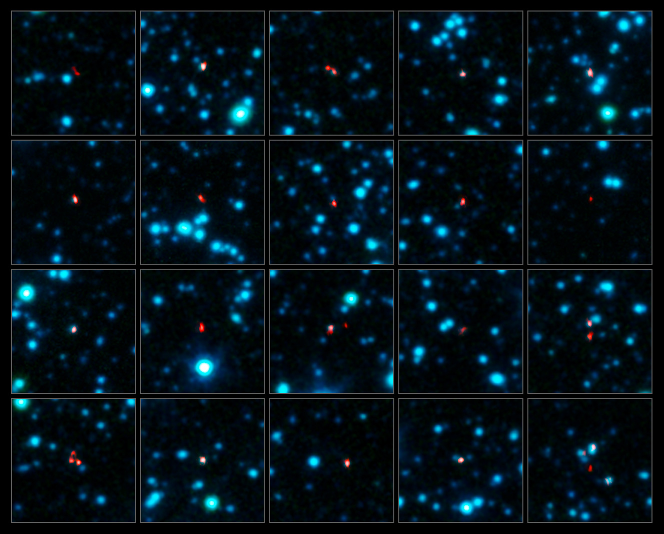 Los mayores brotes de nacimiento de estrellas en el Universo primitivo tuvieron lugar en galaxias que contenían grandes cantidades de polvo cósmico. Pero el polvo que contienen esas galaxias tan fértiles las oscurece a la vista, haciéndolas difíciles de observar con telescopios normales. Durante 10 años los astrónomos han intentado tomar imágenes cercanas de estas jóvenes galaxias, todas ellas sufriendo un masivo "baby boom" estelar. Ahora, después de solo cuatro semanas en acción, el telescopio especial ALMA ha conseguido encontrar más de 100. ¡Esto es más de las que han encontrado todos los otros telescopios juntos! Puedes ver una selección de esas galaxias en estas fotografías.